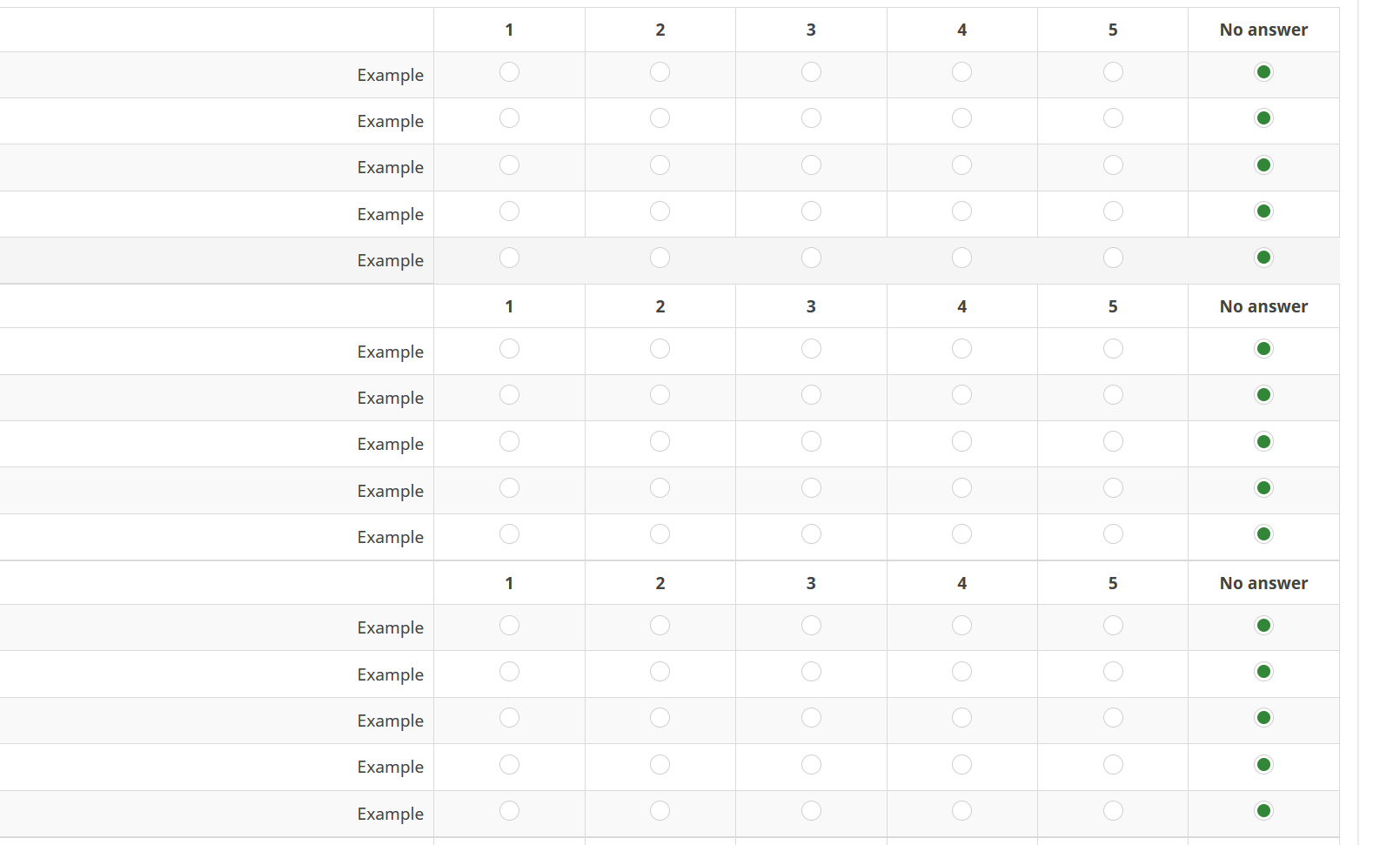 Repeat Header functionality to group questions together and have the answer options repeated (instead of having the answer options appear only once). |