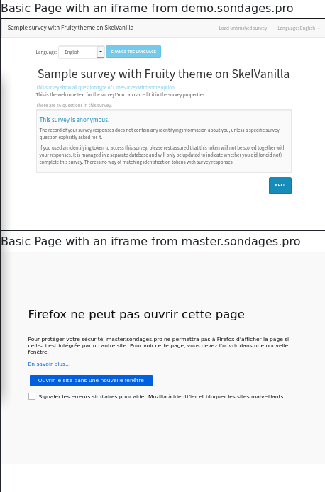 | Steps To Reproduce | Create a webpage with an iframe to survey listing | ||||