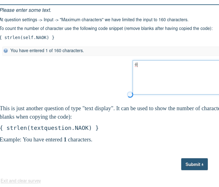 2015-07-21 11:21 … yes a while ago … And seems i update strlmen to use mb_strlen : https://github.com/LimeSurvey/LimeSurvey/commit/c031c7d24d1fecf21dc970e8bccb38eb4abe0a9f#diff-a974f1aca3b64170e04f9ac415aadb10d9108696f0ae4ce07caee89d8a1447d3R2570 seems currently too : https://github.com/LimeSurvey/LimeSurvey/blob/70507e27f6d1886bb50d52d3833284450639c684/application/helpers/expressions/em_core_helper.php#L2678 |
