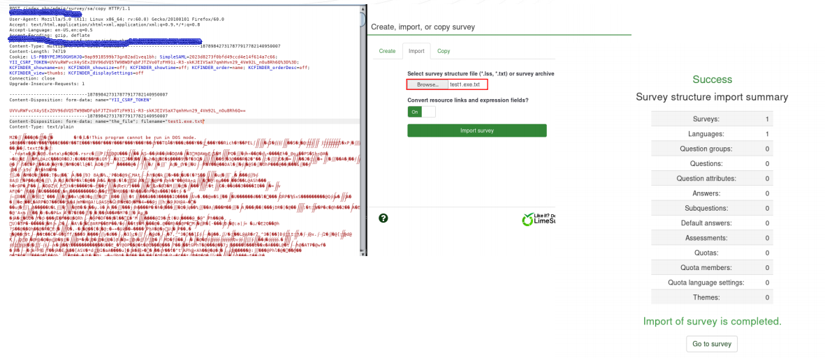 Fixed issue 16817: Missing MIME type check on survey import (#1638) * fix bypassing-file-upload-restrictions in import survey * using LSFileHelper to check mimetype & remove 'application/octet-stream' * add 'application/xml','application/zip','text/xml' to allow list mime types Co-authored-by: a.albatayinah@psau.edu.sa <a.albatayinah@psau.edu.sa> |
