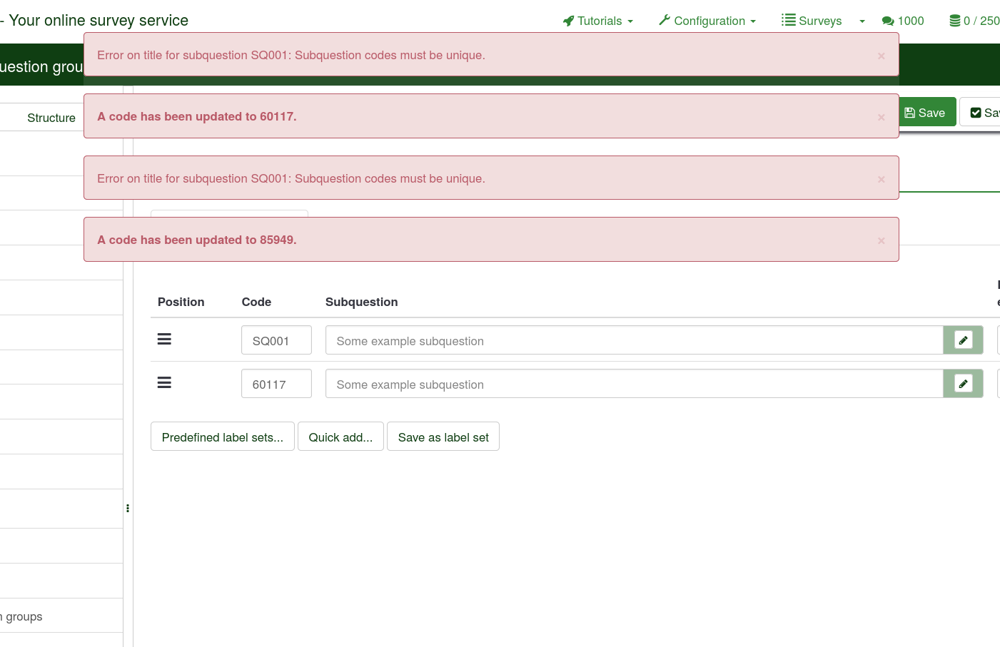 | Summary | 16844: Saving two subquestions with same question code in multilingual survey gives weird error message | ||||