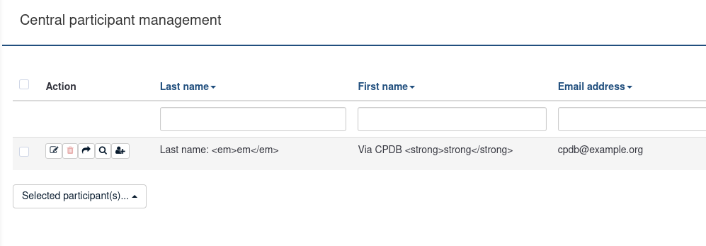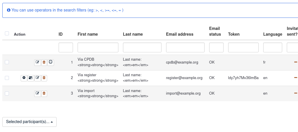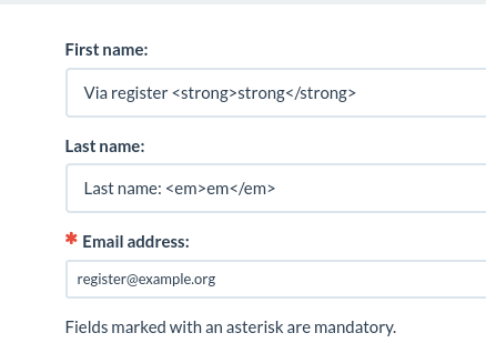firstname,lastname,email Via import <strong>strong</strong>,Last name: <em>em</em>,import@example.org | ||||