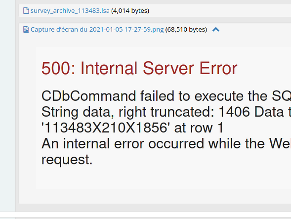 ? Admin user can update question type for example. Moving for a long text to a single choice Can lauch a 500 erro, but i really think showing «CDbCommand failed to execute the SQL statement: SQLSTATE[22001]: String data, right truncated: 1406 Data too long for column '721221X2043X31723' at row 1» for public user is not the best way to do.