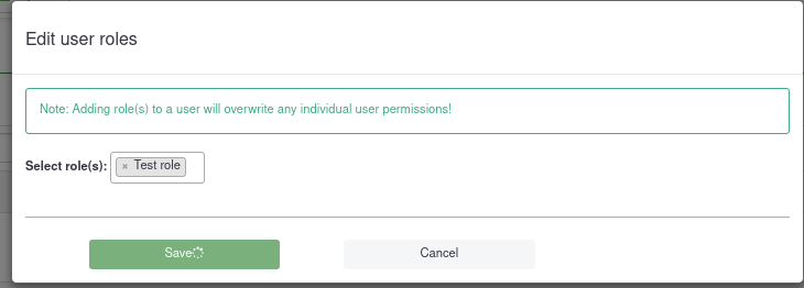 In the assignment of roles there was already a message, which always appears: roles.png Added a warning message to the assignment of permissions, which appears only if the user has some role assigned: permissions.png Also modified the controller so that it effectively cleans up the roles when you assign individual permissions. |