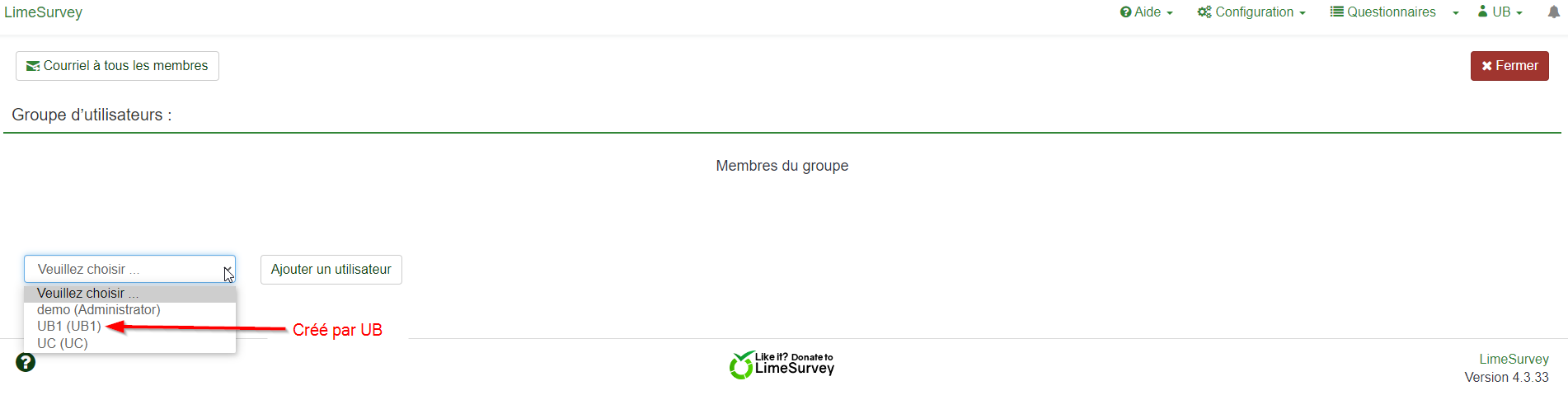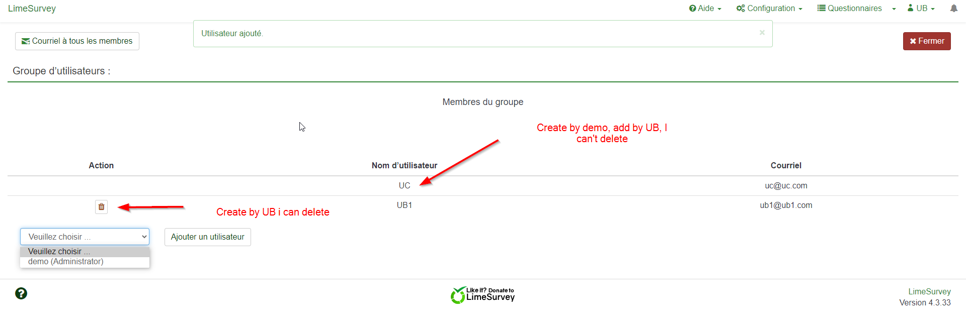 User UB creates 2 accounts: UB1 and UB2 He will not be able to delete the UC and admin accounts, even if he has all the rights for the management of his group. There is the confidentiality issue if we do not want UB to see all the user accounts present in our installation of LimeSurvey. In my case, I have over 400 accounts and you never know. I did my tests on the demo site which is in V4.3.33, but I have the problem in V3. Here is the link on the forum for managing users and groups. I also have the problem on users: | ||||
