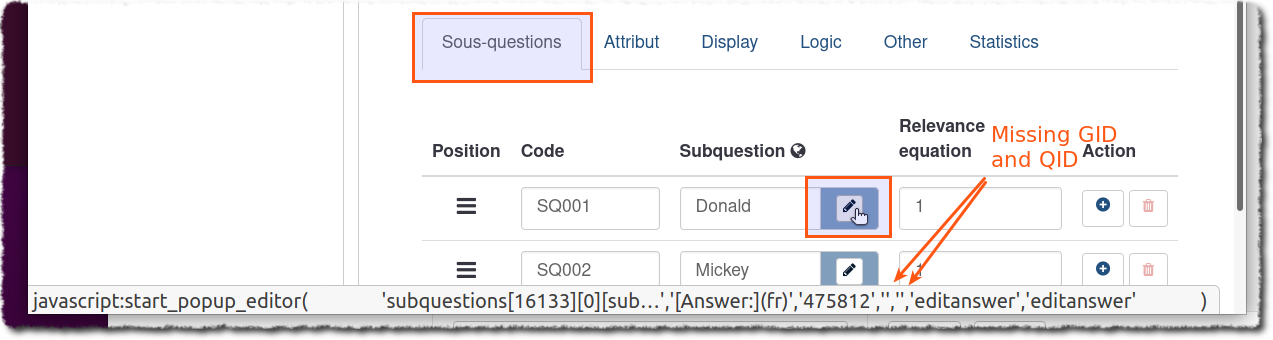 Found the rewrite origin, my guess is : this is done in javascript. There's somewhere a rewrite based on <A class=editorLink which erase the gid and qid parameters to the popup. I suppose the rewrite function to be updateRowProperties() in ./assets/scripts/admin/questionEditor.js ScreenShot #1 It can't find the input[name=gid] and the input[name=qid] (returns undefined Screenshot #2) and simply clear both parameters in the URL =>from my point of view both required input[name=gid] and input[name=qid] should be made available to this function updateRowProperties for the popup to work properly. |
