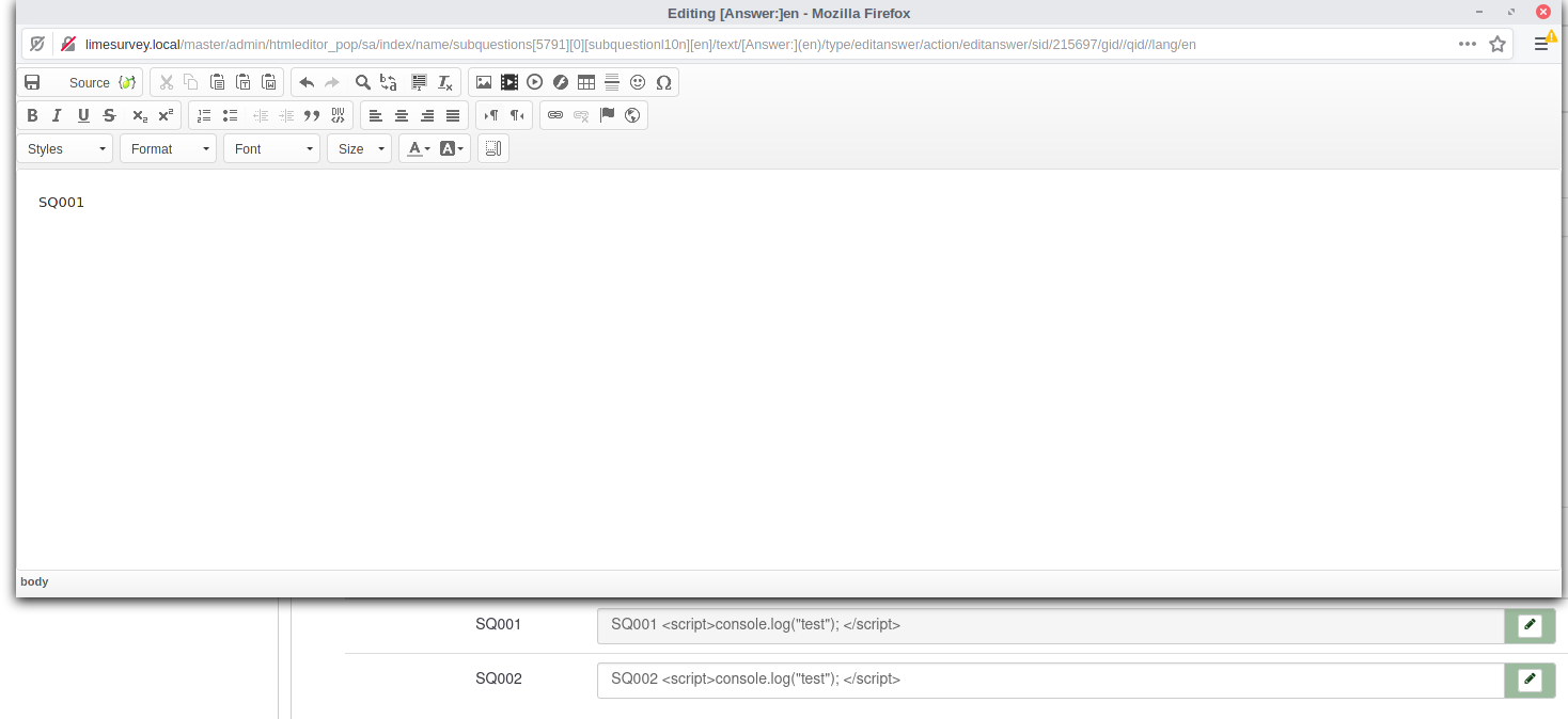 | Description | When selecting "popup HTML editor" as the standard HTML editor, the popup editor shows a 403 whatever text field is edited. Switching to Inline editor solves the problem but the 403 is still this there when editing subquestions texts, making this bug partially blocking for my users. | ||||