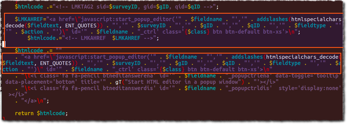 Hacking application//helpers/admin/htmleditor_helper.php as in screen shot #1 => is there somewhere a routine rewriting "A HREF='javascript..." either on $htmlcode at the PHP level of after in the DOM at a JS level ? Unfortunately I'm totally limesurvey-dev-model blind and I think I can't go further debugging this... |