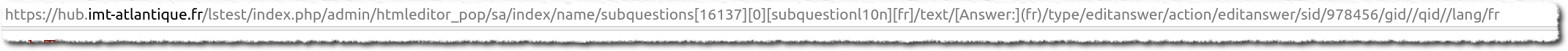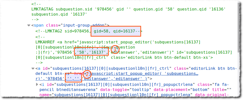 As you may see on https://bugs.limesurvey.org/file_download.php?file_id=14383&type=bug sid, gid qns qid are set, it's the calling link javascript:call_popup_editor(... for subquestion.qid=16138 on the question editor form index.php/questionAdministration/view/surveyid/978456/gid/58/qid/16136 that misses the correct parms This link is apparently rewritten somewhere as it seems to be correct from the PHP generation function Anyway, DB coherence check is fine and I could no find any question see screenshot ttached |