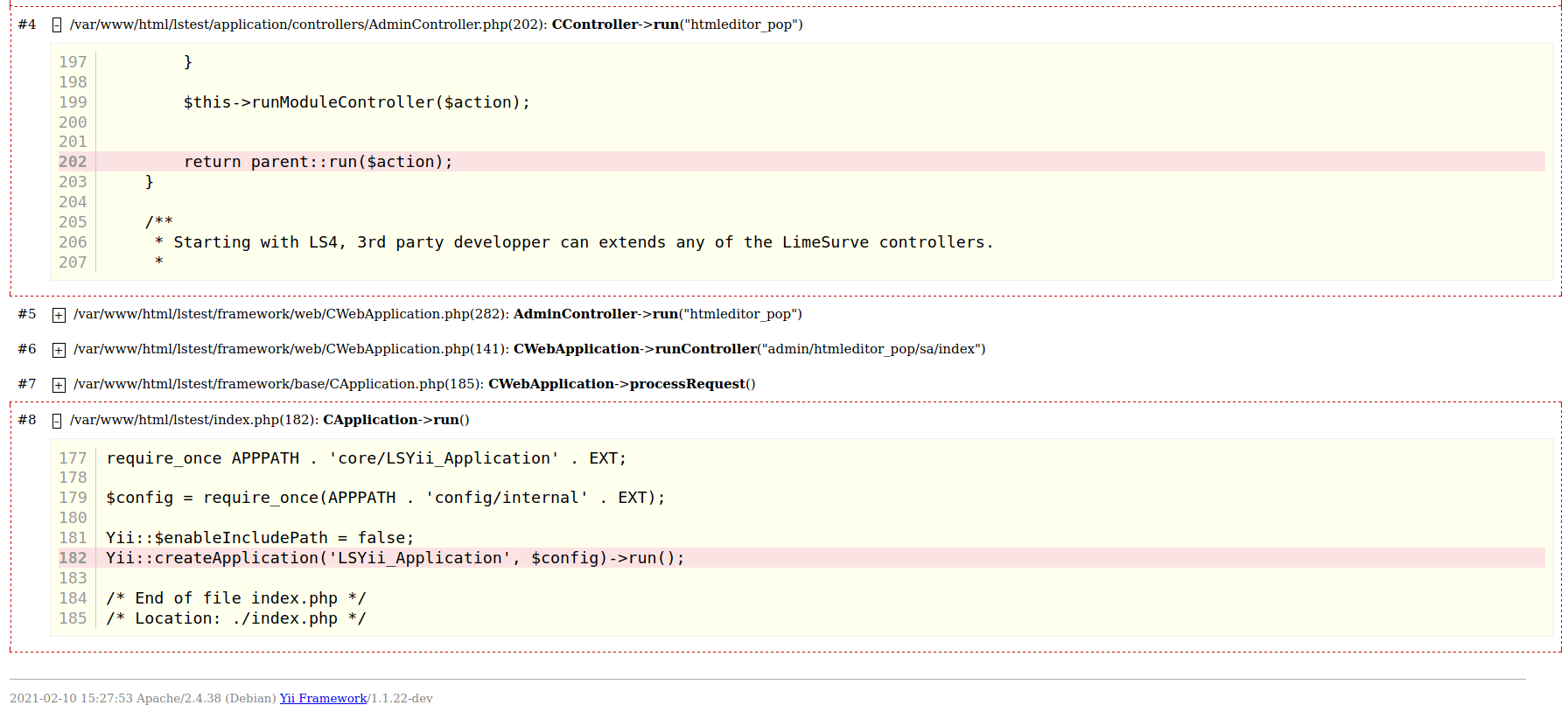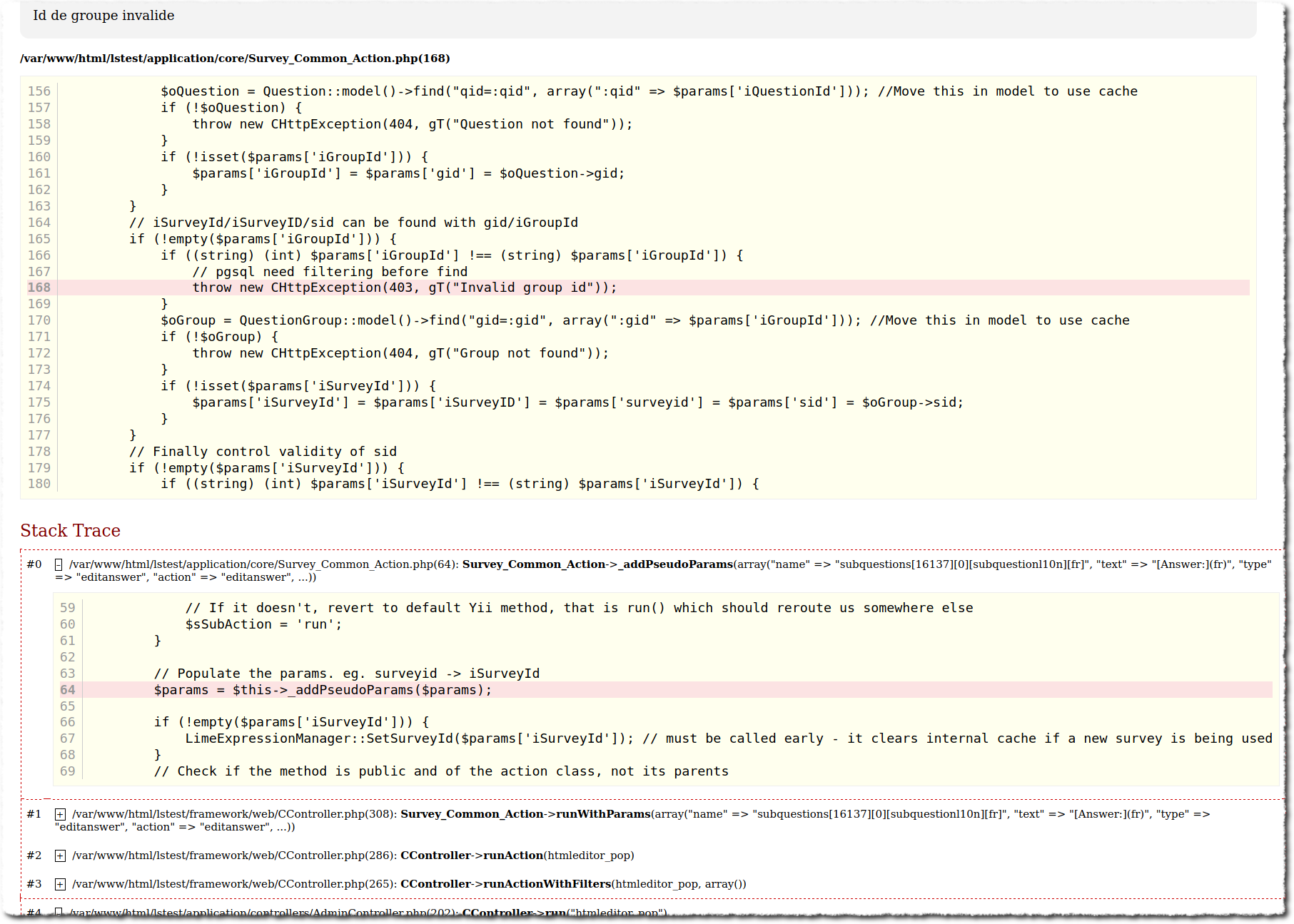 We have a server that was running an older version of Limesurvey (4.3.15+200907). I turned it back on to check if the error existed in that version and in fact it didn't. But the server running the latest release still has that error. It started with one of the later 4.x versions and still persists with 5.x. I enabled debug mode and saved the html file containing the error message and stack trace. Does it contain any sensitive information? If not I would just upload the whole html file instead of creating a series of screenshots :) |