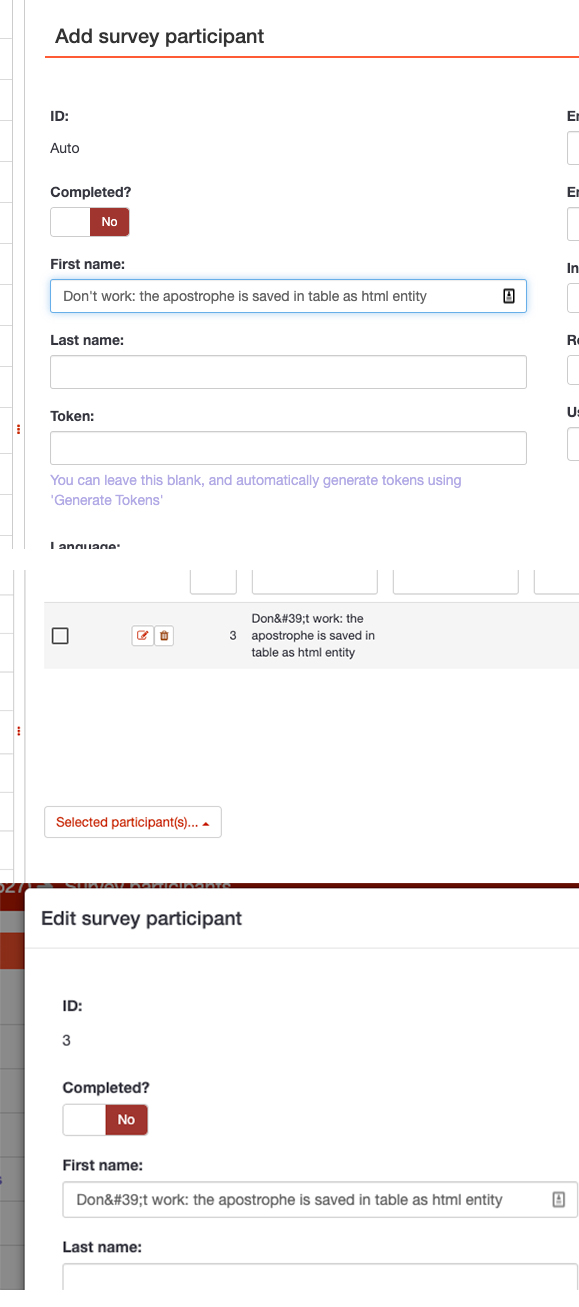 | Steps To Reproduce | Create survey, add participiant and in the firstname or lastname filed (the same happens in the attribute field) insert a "'" (apostrophe) or a double quote character. Save and go in the list the value appear broken | ||||