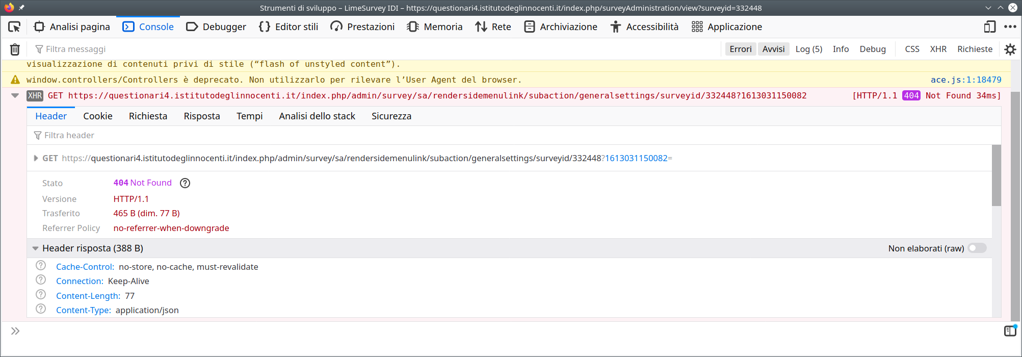 | Description | when I try to edit survey options from gears in main panel, LS hangs. In browser console I see a 404 error for the following link: https://domain.com/index.php/admin/survey/sa/rendersidemenulink/subaction/generalsettings/surveyid/332448?1613031150082= everything works. I have this problem in every 4.x release. | ||||