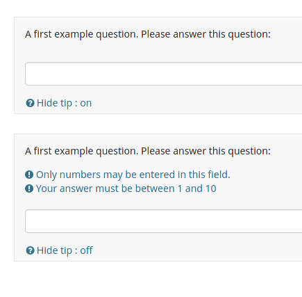 Hey Denis, i also think the label for the user should be "Hide tip". This is confusing. It should be something like "Do you want to show the tip for this question?" and then the user could select Yes (showing the tip) or No (for not showing the tip). Internally (in the software) we should use 0 for "don't show the tip" and 1 for "show the tip". |