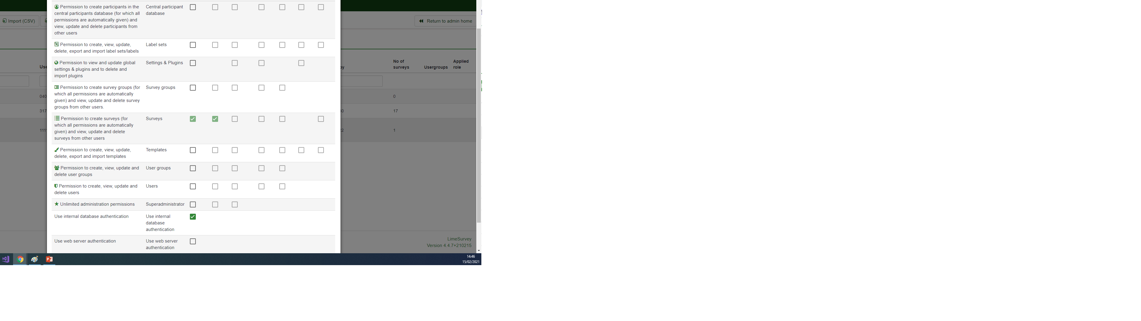 | Complete LimeSurvey version number (& build) | Version 4.4.7+210215 | ||||