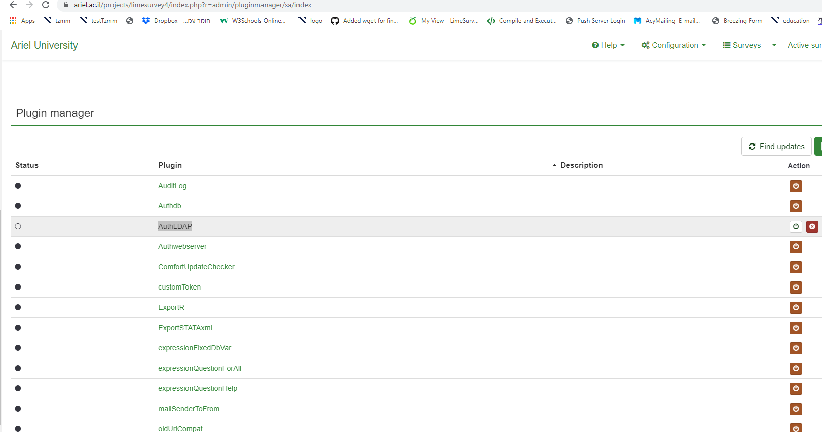 I mean : did you have a ny plugin activated. No need to activate AuthLDAP (or anything else) Since the issue seems reatled to plugin : i think you can have an Auth plugin :) can you check with debug mode activated ? |