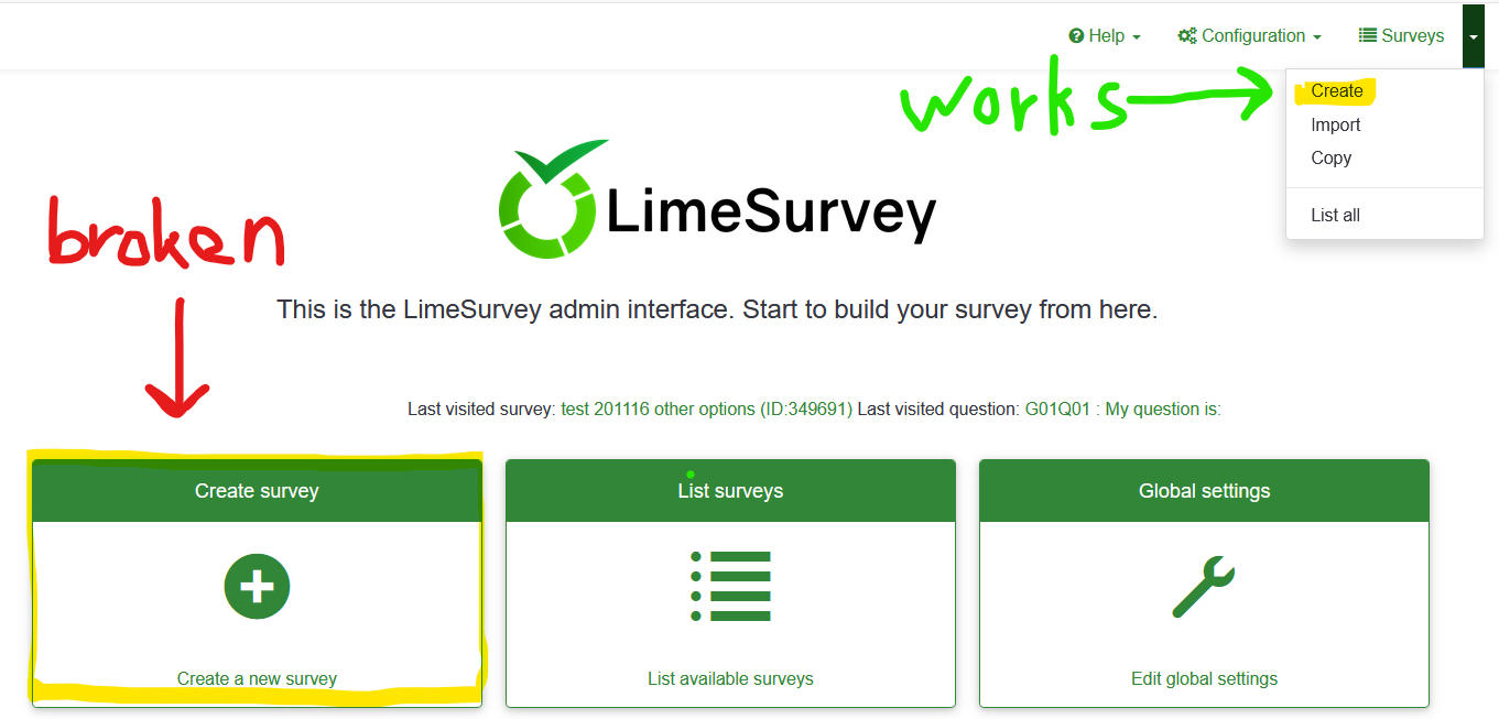 | Description | Not possible to create a new survey with the "create survey" button on The button links to Creating a new survey from the top menu "surveys" works fine as it links to | ||||
