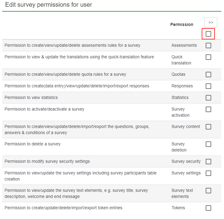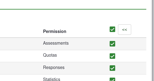 | Description | If we add users to the survey permissions and want to assign all permissions, we have to tick them one-by-one which is very annoying when adding lots of users. I request a "top of the column" chreck box that will enable all oher checkboxes with one click. See screenshot. | ||||