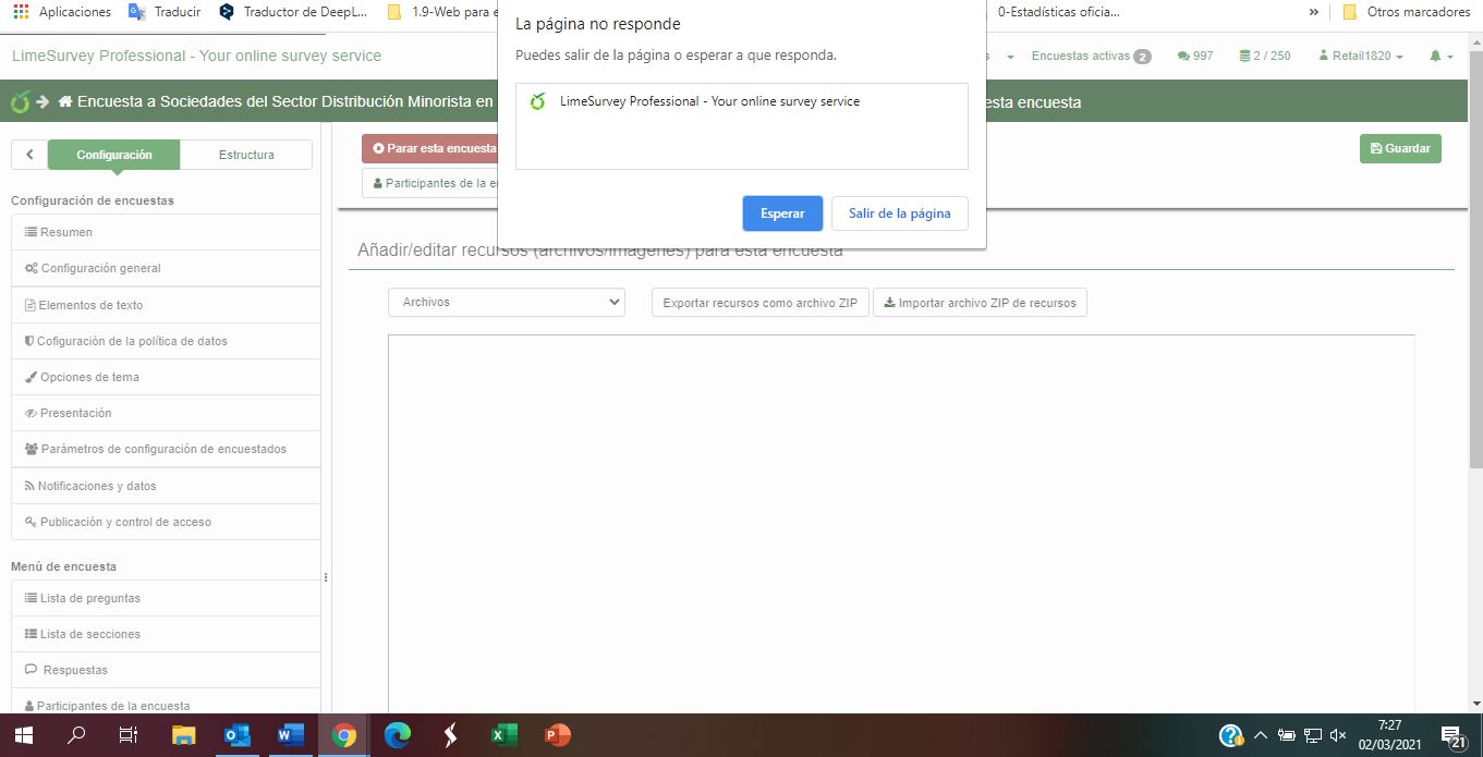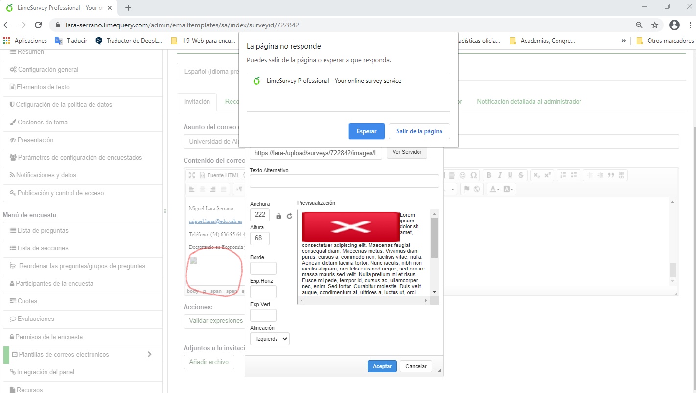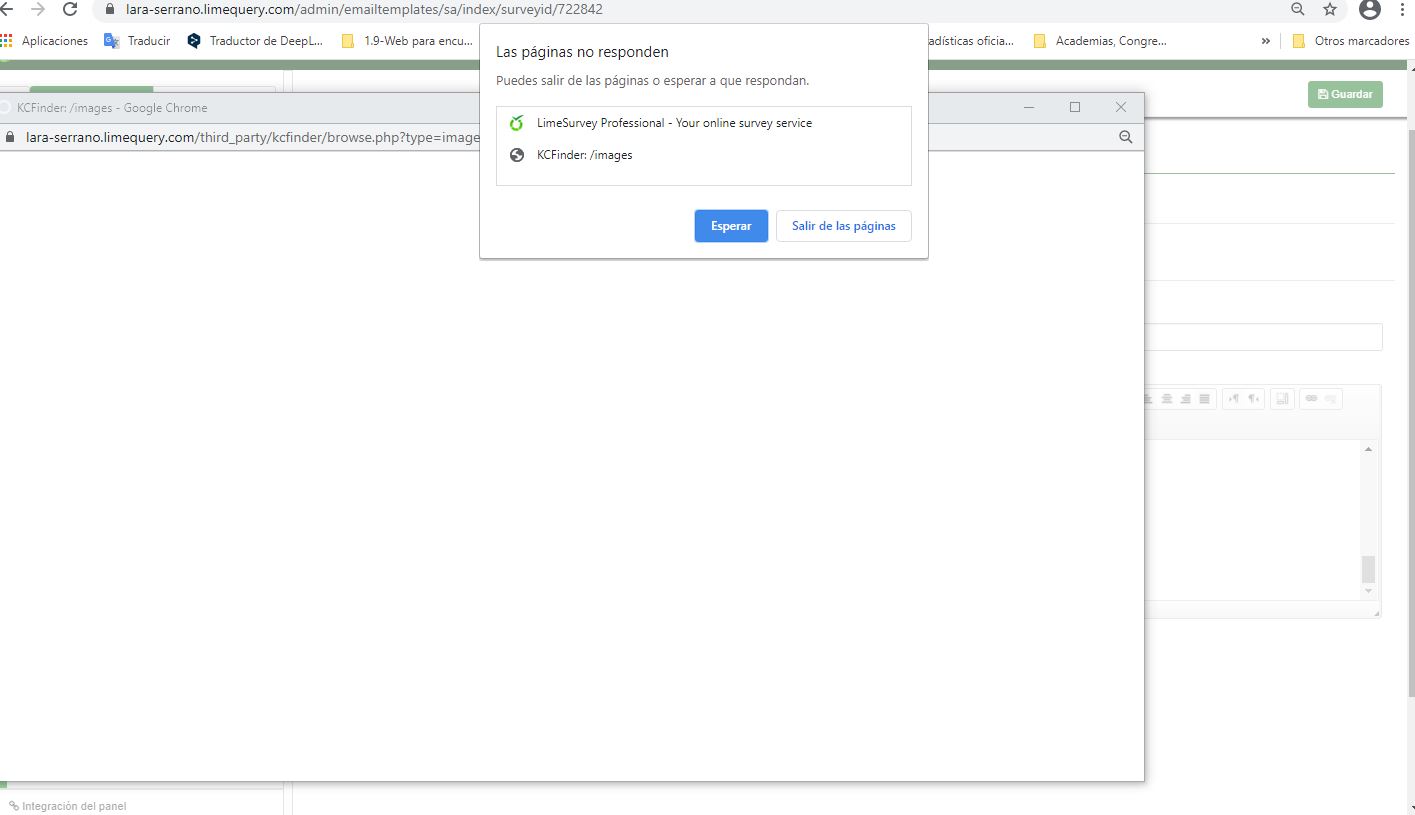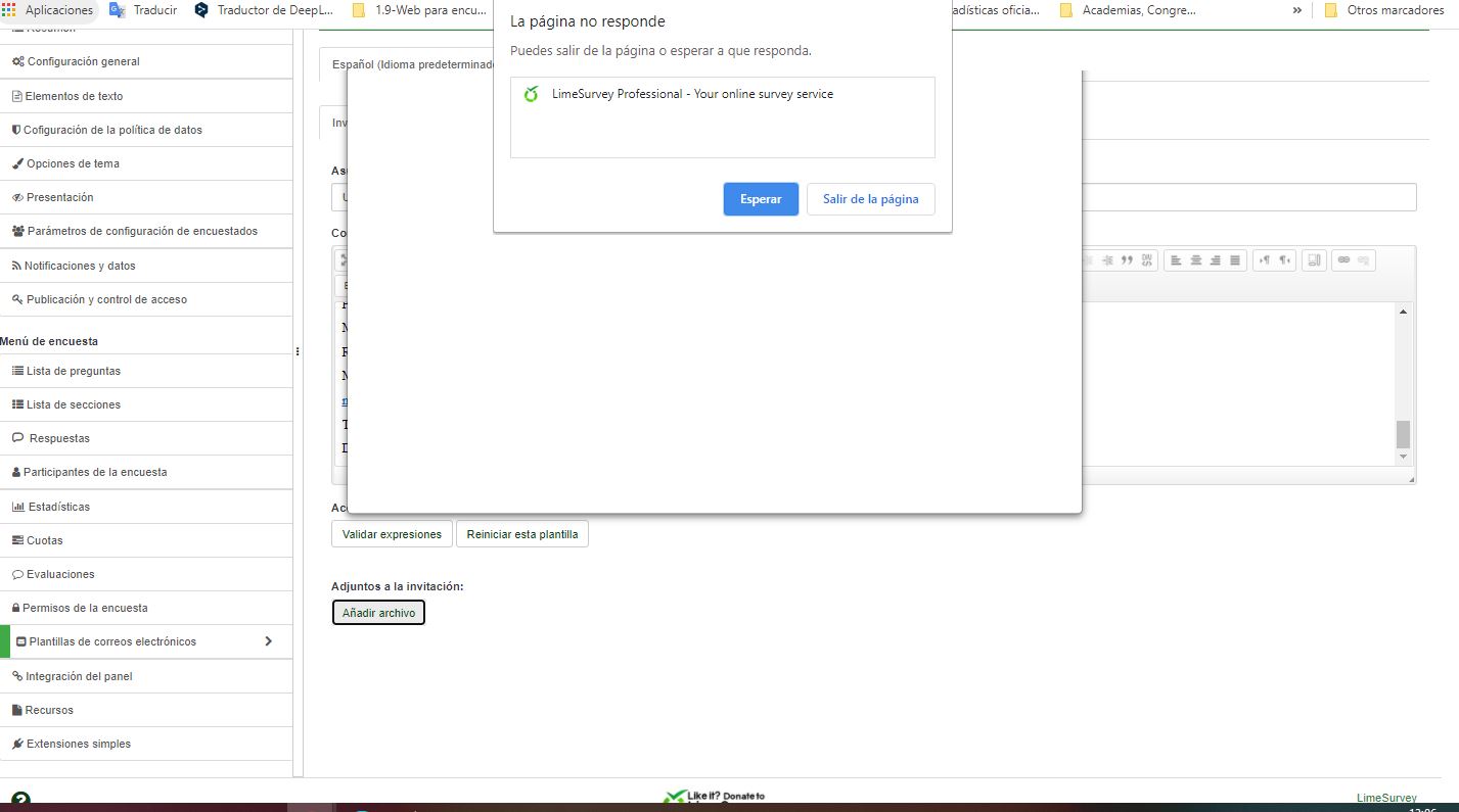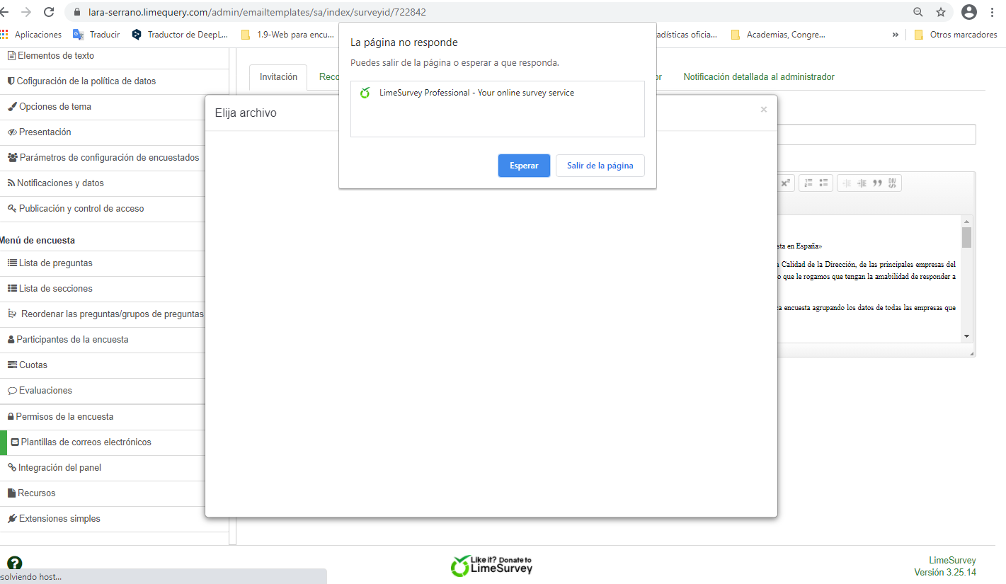 | Description | (First of all confirm that the actual version is 3.25.14, but it is not available in drop down box) In a previous survey (ID 325974) draft of the current one (ID 722842), I was able to upload files and images and add them to the e.mail, but now, when I try to do so, LimeSurvey crashes as well. | ||||