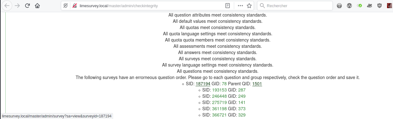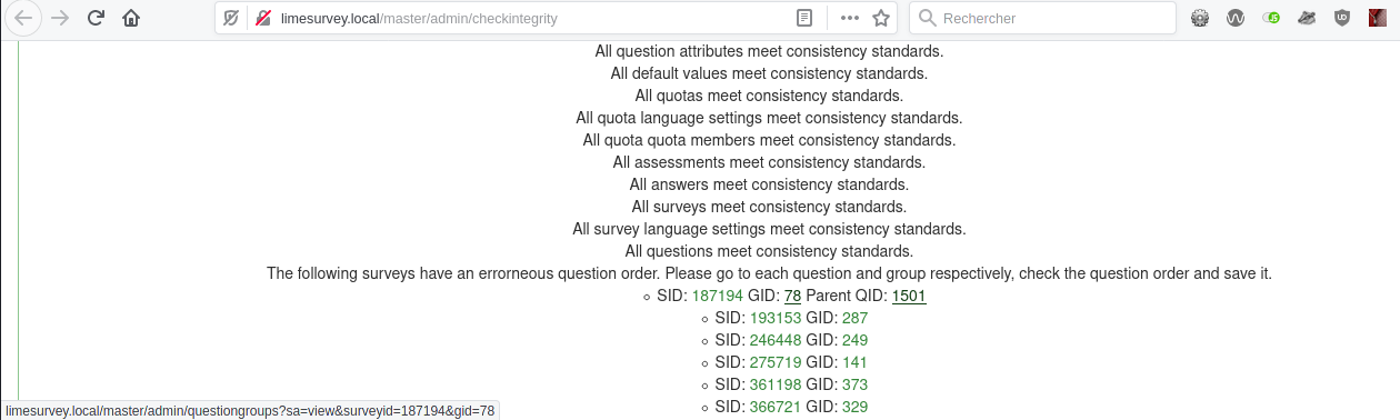 | Steps To Reproduce | Unsure it work with included lss, seems to but still unsure Else : try to break DB Go to check integrity, click on Survey link and Group plink | ||||