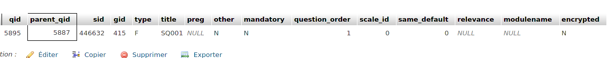| Description | After importing a survey exported to .lss with an older version of LimeSurvey I can't edit any question. Clicking on the link to edit question (index.php/questionAdministration/view?surveyid=839658&gid=634&qid=3105&1614289115575) I get a 500 error: An exception has been thrown during the rendering of a template ("Question and its behaviors do not have a method or closure named "relevance"."). | ||||