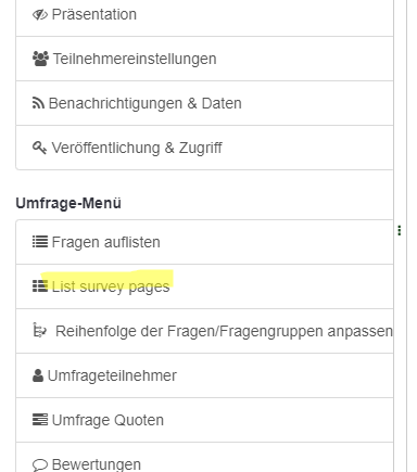 | Description | The new term "Survey pages" seems to be missing at the translation. Though according to https://translate.limesurvey.org/projects/limesurvey-4/de/default/?filters%5Bstatus%5D=untranslated&sort%5Bby%5D=priority&sort%5Bhow%5D=desc the German translation is not marked as missing that text, that string is shown in English, see screenshot. | ||||
