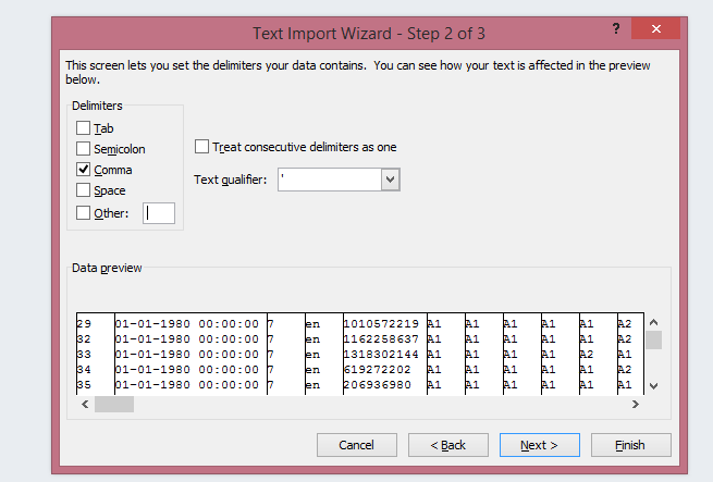 The dat file (CSV) seems to be fine. Can I ask you to provide a dat file that works and has text delimiter and commas? |
