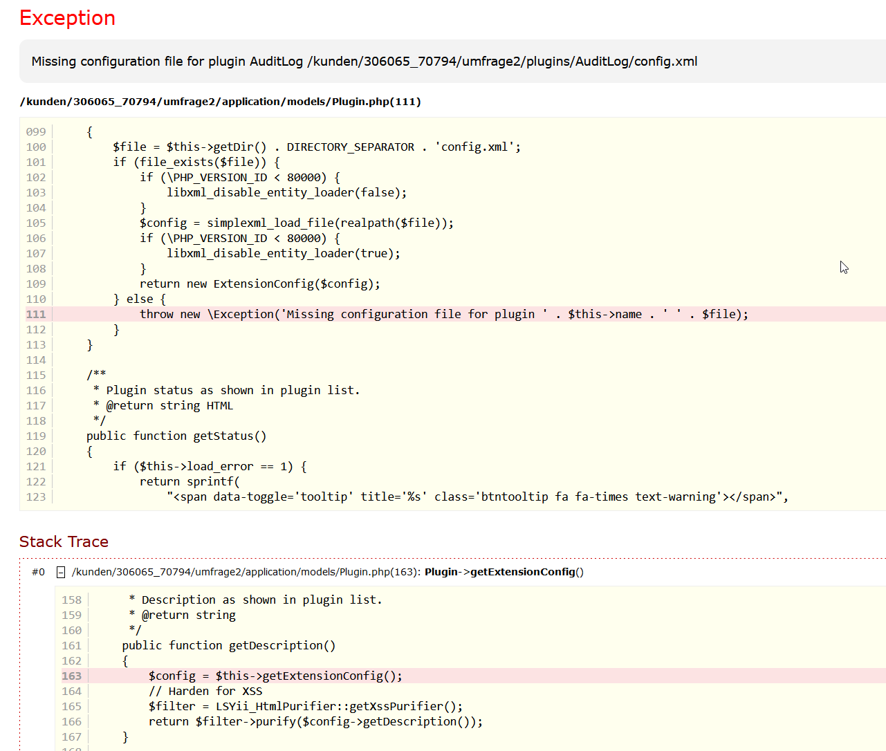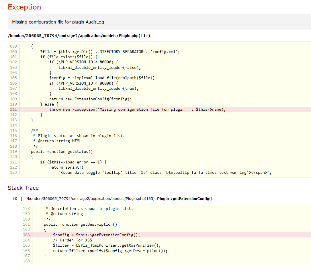 | Description | If I try to open the plugin manager I get this screen: 500: Interner Serverfehler Ein interner Fehler ist aufgetreten, während der Webserver Ihre Anfrage bearbeitet hat. Bitte kontaktieren Sie Administrator, um dieses Problem zu melden. I have: LimeSurvey I use a Maria-DB Version 10.4. On the server if I look into the lime survey folder I find under application/core/plugins/AuditLog So to me it looks like the files are there. But for whatever reason it does not find them. | ||||