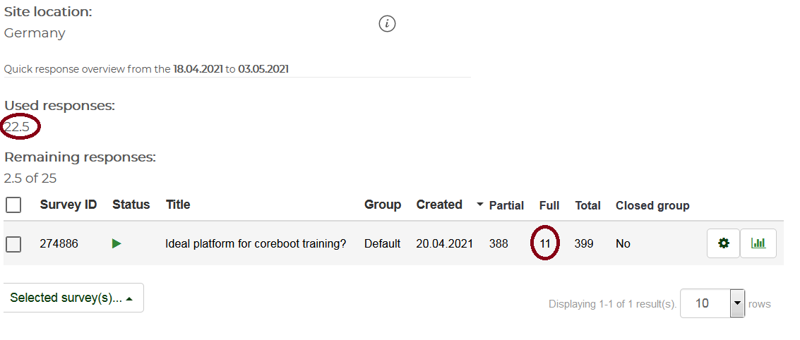 | Description | A copy of my messages to tech support: ==> 1) Limesurvey account overview shows that my mike_banon "Used responses: 22.5" (how this even could end with .5 ?). But on my only public survey's (ID 274886) Responses page - I enable the "completed" filter, and see that only 11 responses have been submitted, and all the other ~300 are empty (from the people who just opened a link but didn't write anything). And I don't have any other active public surveys and this balance couldn't have been spent elsewhere. So it's showing that I spent 22.5 of my 25 survey balance, instead of 11, must be a mistake. Please fix before I run out of responses, especially since this survey is done for the benefit of opensource community. ==> 2) In reply to > A survey is taken and only half completed => 0.5 response If not a bug, I could only think of this variant - but I haven't seen such responses yet. And don't know if there's a way to find such responses without clicking all 300+ marked as X completed, because there are only three options for a search filter regarding the completion: yes, no, any ==> 3) In reply to > All marked as completion "No" are not completed and are marked as half response. I think, if all the survey fields are empty (in example, a person opened a survey link and closed it without doing anything) - then a LimeSurvey doesn't use a 0.5 balance for this response. Otherwise my 25 monthly balance would have been long spent by these 469 partial responses. So, maybe a LimeSurvey uses 0.5 balance only if a person wrote at least something in his partial response. But how to find such partial responses? If I use this "completion "No"" filter, I see all ~400 partial responses. And I don't know how to find the partial responses where a person wrote at least something, without opening all 400 responses in a new tab and looking manually. Please, could you suggest how to find such partial responses with some reply? If right now there is no way, Feature request: please consider adding a new "completion "Partial"" filter to a LimeSurvey | ||||