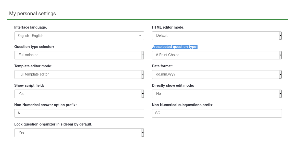 | Description | When try to update Preselected question type in personal settings : it stay to the 1st selected | ||||
