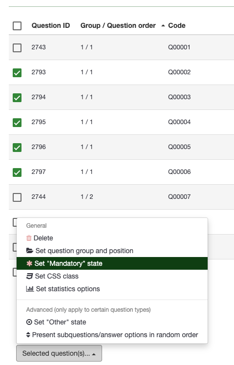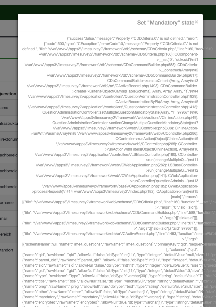 | Additional Information | {"success":false,"message":"Property \"CDbCriteria.0\" is not defined.","error":{"code":500,"type":"CException","errorCode":0,"message":"Property \"CDbCriteria.0\" is not defined.","file":"\/var\/www\/apps3\/limesurvey2\/framework\/db\/schema\/CDbCriteria.php","line":160,"trace":"#0 \/var\/www\/apps3\/limesurvey2\/framework\/db\/schema\/CDbCriteria.php(160): CComponent->set('0', 'sid=:sid')\n#1 \/var\/www\/apps3\/limesurvey2\/framework\/db\/schema\/CDbCommandBuilder.php(588): CDbCriteria->construct(Array)\n#2 \/var\/www\/apps3\/limesurvey2\/framework\/db\/schema\/CDbCommandBuilder.php(617): CDbCommandBuilder->createCriteria(Array, Array)\n#3 \/var\/www\/apps3\/limesurvey2\/framework\/db\/ar\/CActiveRecord.php(1493): CDbCommandBuilder->createPkCriteria(Object(CMysqlTableSchema), Array, Array, Array, 't.')\n#4 \/var\/www\/apps3\/limesurvey2\/application\/controllers\/QuestionAdministrationController.php(1929): CActiveRecord->findByPk(Array, Array, Array)\n#5 \/var\/www\/apps3\/limesurvey2\/application\/controllers\/QuestionAdministrationController.php(1413): QuestionAdministrationController::setMultipleQuestionMandatoryState(Array, 'Y', 979671)\n#6 \/var\/www\/apps3\/limesurvey2\/framework\/web\/actions\/CInlineAction.php(49): QuestionAdministrationController->actionChangeMultipleQuestionMandatoryState()\n#7 \/var\/www\/apps3\/limesurvey2\/framework\/web\/CController.php(308): CInlineAction->runWithParams(Array)\n#8 \/var\/www\/apps3\/limesurvey2\/framework\/web\/CController.php(286): CController->runAction(Object(CInlineAction))\n#9 \/var\/www\/apps3\/limesurvey2\/framework\/web\/CController.php(265): CController->runActionWithFilters(Object(CInlineAction), Array)\n#10 \/var\/www\/apps3\/limesurvey2\/application\/controllers\/LSBaseController.php(160): CController->run('changeMultipleQ...')\n#11 \/var\/www\/apps3\/limesurvey2\/framework\/web\/CWebApplication.php(282): LSBaseController->run('changeMultipleQ...')\n#12 \/var\/www\/apps3\/limesurvey2\/framework\/web\/CWebApplication.php(141): CWebApplication->runController('questionAdminis...')\n#13 \/var\/www\/apps3\/limesurvey2\/framework\/base\/CApplication.php(185): CWebApplication->processRequest()\n#14 \/var\/www\/apps3\/limesurvey2\/index.php(182): CApplication->run()\n#15 {main}","traces":[{"file":"\/var\/www\/apps3\/limesurvey2\/framework\/db\/schema\/CDbCriteria.php","line":160,"function":"set","class":"CComponent","type":"->","args":["0","sid=:sid"]},{"file":"\/var\/www\/apps3\/limesurvey2\/framework\/db\/schema\/CDbCommandBuilder.php","line":588,"function":"construct","class":"CDbCriteria","type":"->","args":[["sid=:sid"]]},{"file":"\/var\/www\/apps3\/limesurvey2\/framework\/db\/schema\/CDbCommandBuilder.php","line":617,"function":"createCriteria","class":"CDbCommandBuilder","type":"->","args":[["sid=:sid"],{":sid":979671}]},{"file":"\/var\/www\/apps3\/limesurvey2\/framework\/db\/ar\/CActiveRecord.php","line":1493,"function":"createPkCriteria","class":"CDbCommandBuilder","type":"->","args":[{"schemaName":null,"name":"lime4_questions","rawName":"lime4_questions","primaryKey":"qid","sequenceName":"","foreignKeys":[],"columns":{"qid":{"name":"qid","rawName":"qid","allowNull":false,"dbType":"int(11)","type":"integer","defaultValue":null,"size":11,"precision":11,"scale":null,"isPrimaryKey":true,"isForeignKey":false,"autoIncrement":true,"comment":""},"parent_qid":{"name":"parent_qid","rawName":"parent_qid","allowNull":false,"dbType":"int(11)","type":"integer","defaultValue":0,"size":11,"precision":11,"scale":null,"isPrimaryKey":false,"isForeignKey":false,"autoIncrement":false,"comment":""},"sid":{"name":"sid","rawName":"sid","allowNull":false,"dbType":"int(11)","type":"integer","defaultValue":0,"size":11,"precision":11,"scale":null,"isPrimaryKey":false,"isForeignKey":false,"autoIncrement":false,"comment":""},"gid":{"name":"gid","rawName":"gid","allowNull":false,"dbType":"int(11)","type":"integer","defaultValue":0,"size":11,"precision":11,"scale":null,"isPrimaryKey":false,"isForeignKey":false,"autoIncrement":false,"comment":""},"type":{"name":"type","rawName":"type","allowNull":false,"dbType":"varchar(30)","type":"string","defaultValue":"T","size":30,"precision":30,"scale":null,"isPrimaryKey":false,"isForeignKey":false,"autoIncrement":false,"comment":""},"title":{"name":"title","rawName":"title","allowNull":false,"dbType":"varchar(20)","type":"string","defaultValue":"","size":20,"precision":20,"scale":null,"isPrimaryKey":false,"isForeignKey":false,"autoIncrement":false,"comment":""},"preg":{"name":"preg","rawName":"preg","allowNull":true,"dbType":"text","type":"string","defaultValue":null,"size":null,"precision":null,"scale":null,"isPrimaryKey":false,"isForeignKey":false,"autoIncrement":false,"comment":""},"other":{"name":"other","rawName":"other","allowNull":false,"dbType":"varchar(1)","type":"string","defaultValue":"N","size":1,"precision":1,"scale":null,"isPrimaryKey":false,"isForeignKey":false,"autoIncrement":false,"comment":""},"mandatory":{"name":"mandatory","rawName":"mandatory","allowNull":true,"dbType":"varchar(1)","type":"string","defaultValue":null,"size":1,"precision":1,"scale":null,"isPrimaryKey":false,"isForeignKey":false,"autoIncrement":false,"comment":""},"encrypted":{"name":"encrypted","rawName":"encrypted","allowNull":true,"dbType":"varchar(1)","type":"string","defaultValue":"N","size":1,"precision":1,"scale":null,"isPrimaryKey":false,"isForeignKey":false,"autoIncrement":false,"comment":""},"question_order":{"name":"question_order","rawName":"question_order","allowNull":false,"dbType":"int(11)","type":"integer","defaultValue":null,"size":11,"precision":11,"scale":null,"isPrimaryKey":false,"isForeignKey":false,"autoIncrement":false,"comment":""},"scale_id":{"name":"scale_id","rawName":"scale_id","allowNull":false,"dbType":"int(11)","type":"integer","defaultValue":0,"size":11,"precision":11,"scale":null,"isPrimaryKey":false,"isForeignKey":false,"autoIncrement":false,"comment":""},"same_default":