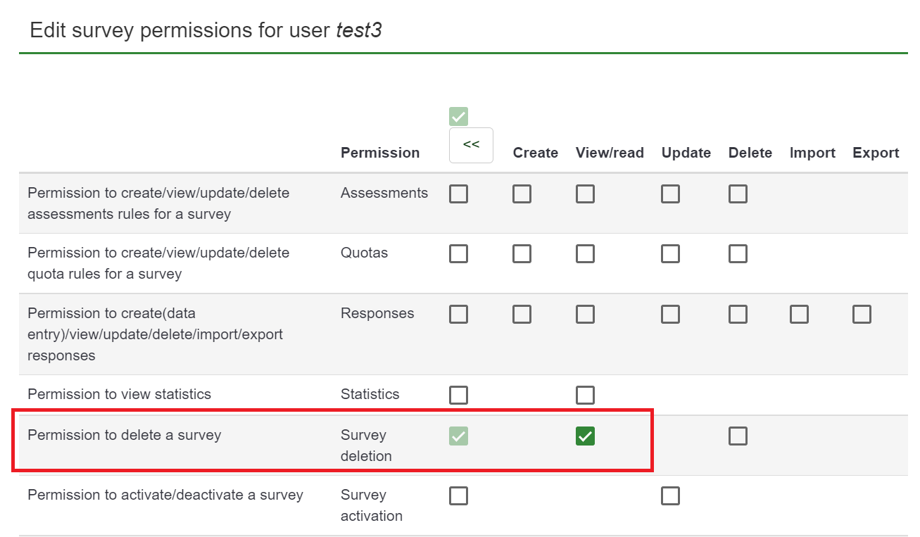 It's a display error. In 3.X : there are a specific test to show the checkbox The line check for survey, and only one right "delete" since read is removed. Here i put the solution 2 : Hide the forced permission (3.X hide the forced permission) You prefer solution 1 : Replace sentence and put "Global permission on this survey" and show forced permission as disabled/checked (with a indication about "to remove this right : you need to remove user form permission)? |