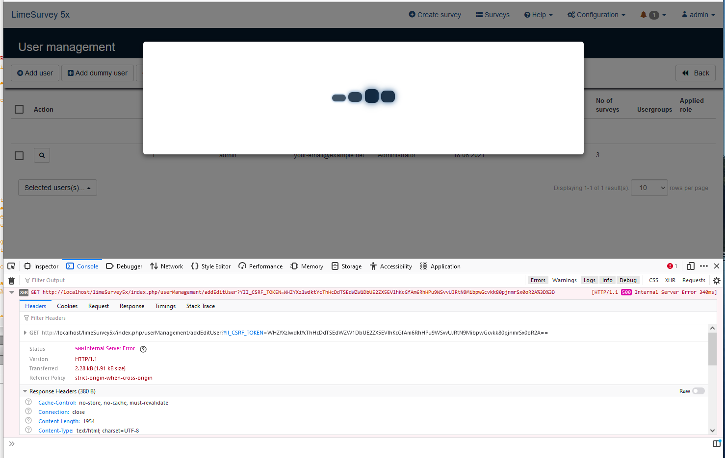 | Description | The modal does not load and a server error is indicated when trying to add a new user. See screenshot. | ||||