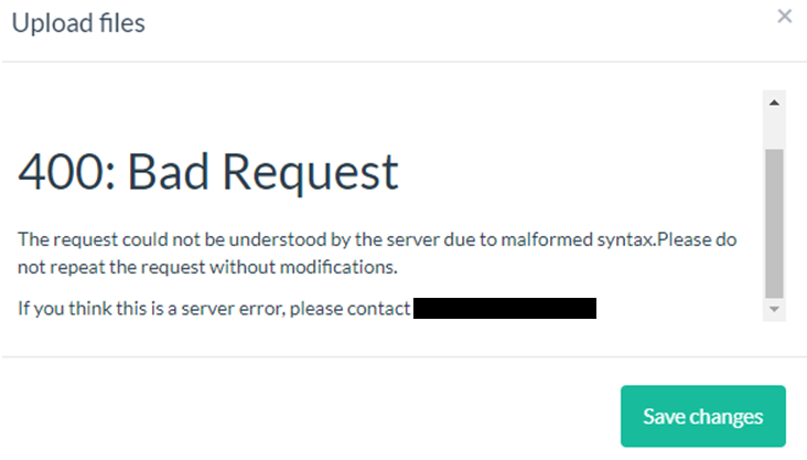 I tested first in Version 5.1.3+210817. In that version I did not get a 400 message, however I did get a frozen window experience with the attached, empty Upload file dialog in the middle of the screen. Clicking on the "x" does not close the window; must refresh the page. Will setup a 3.x test next. |