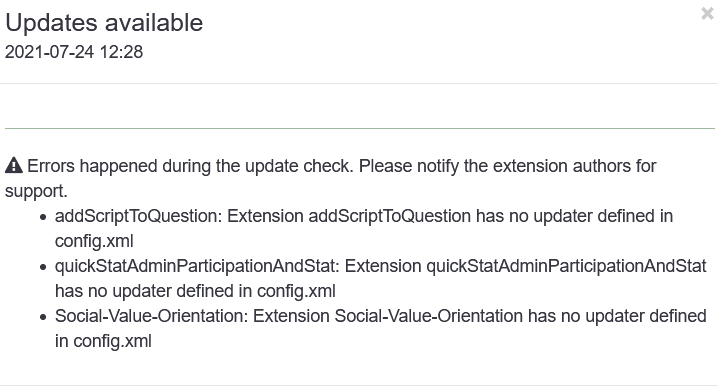 @Denis and @ollehar, thank you very much, I went ahead and updated all the config.xml files , where it needs to be updated, seems the approach to give compatibility versions and check for the <lastSecurityUpdate> tag could be good preliminary approach to handle this. Kudos to your team for helping , this is truly a great survey tools, which has huge potential to run sophisticated analysis down the development line. |