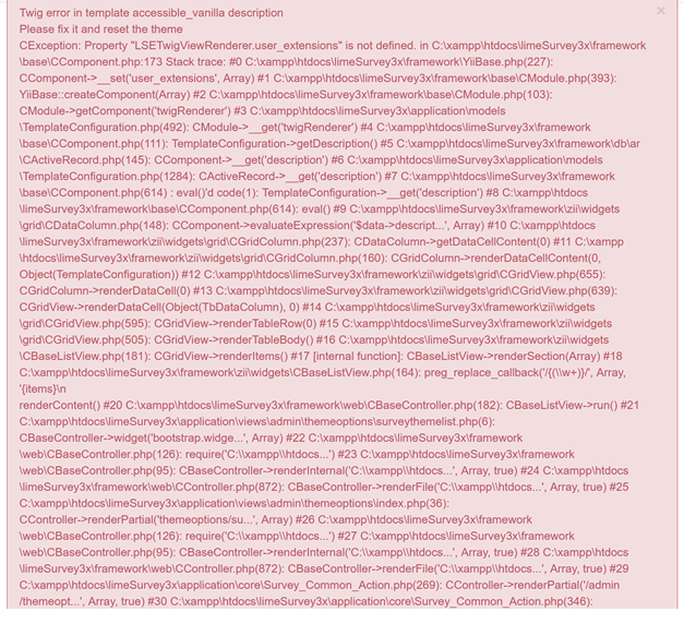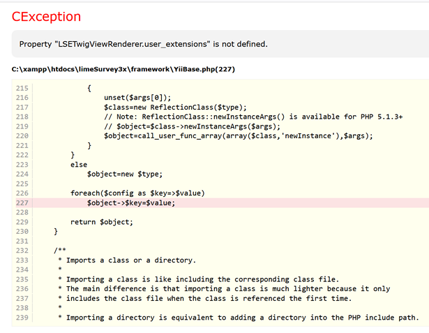 any news on this? in YIIbase.php 227 is it crashing. Property "LSETwigViewRenderer.user_extensions, we make "new" there, for LSETwigViewRenderer. Mustn't the class have the property "user_extensions".? It does not! I can't find this in 3.26, too. |