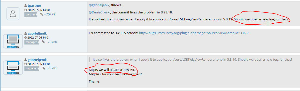 @gabrieljenik, thanks. @DenisChenu, the commit fixes the problem in 3.28.18. It also fixes the problem when I apply it to application/core/LSETwigViewRenderer.php in 5.3.19. Should we open a new bug for that? |
