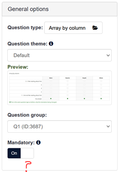 | Description | In the array-by-column question, there is no filed for question relevance in the general options - screenshot attached. If you switch to simple array, insert relevance and switch back to array-by-column, the relevance is applied. | ||||
