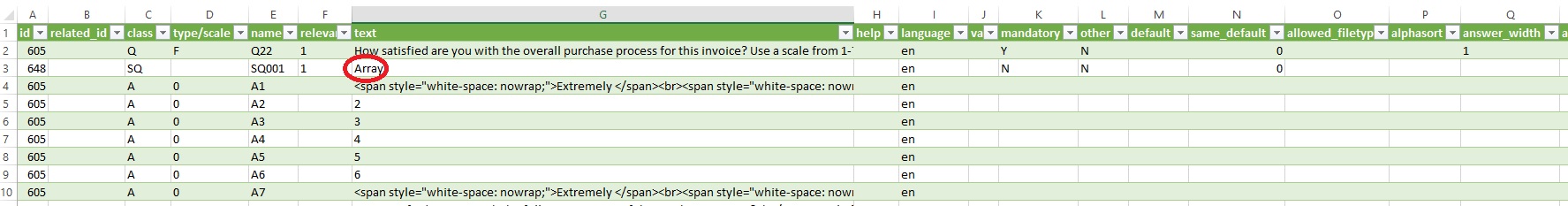 | Summary | 17501: Export of a survey with a single space in the Subquestion of an array results in the word "array" inserted | ||||