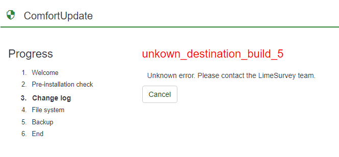 | Description | I was updating my Limesurvey through ComfortUpdate. After updating files, it asked to upgrade database. While upgrading a database, I got the following error message.An non-recoverable error happened during the update. Error details: File C:\Websites\Limesurvey2019\application\helpers\update\updatedb_helper.php, line 3532. Please fix this error in your database and try again | ||||