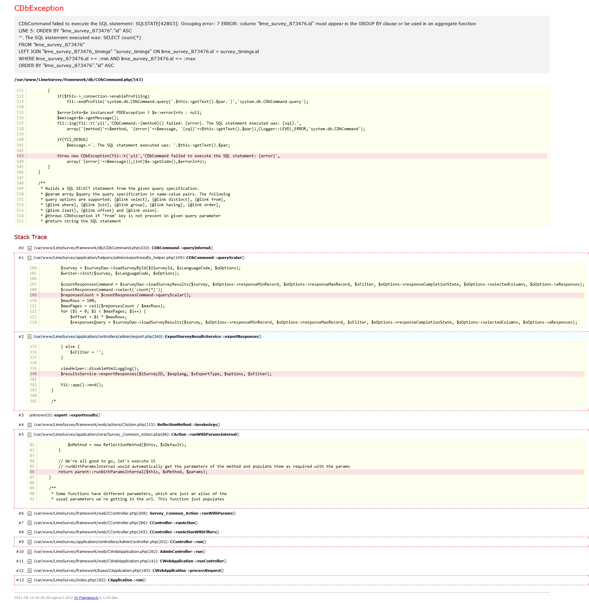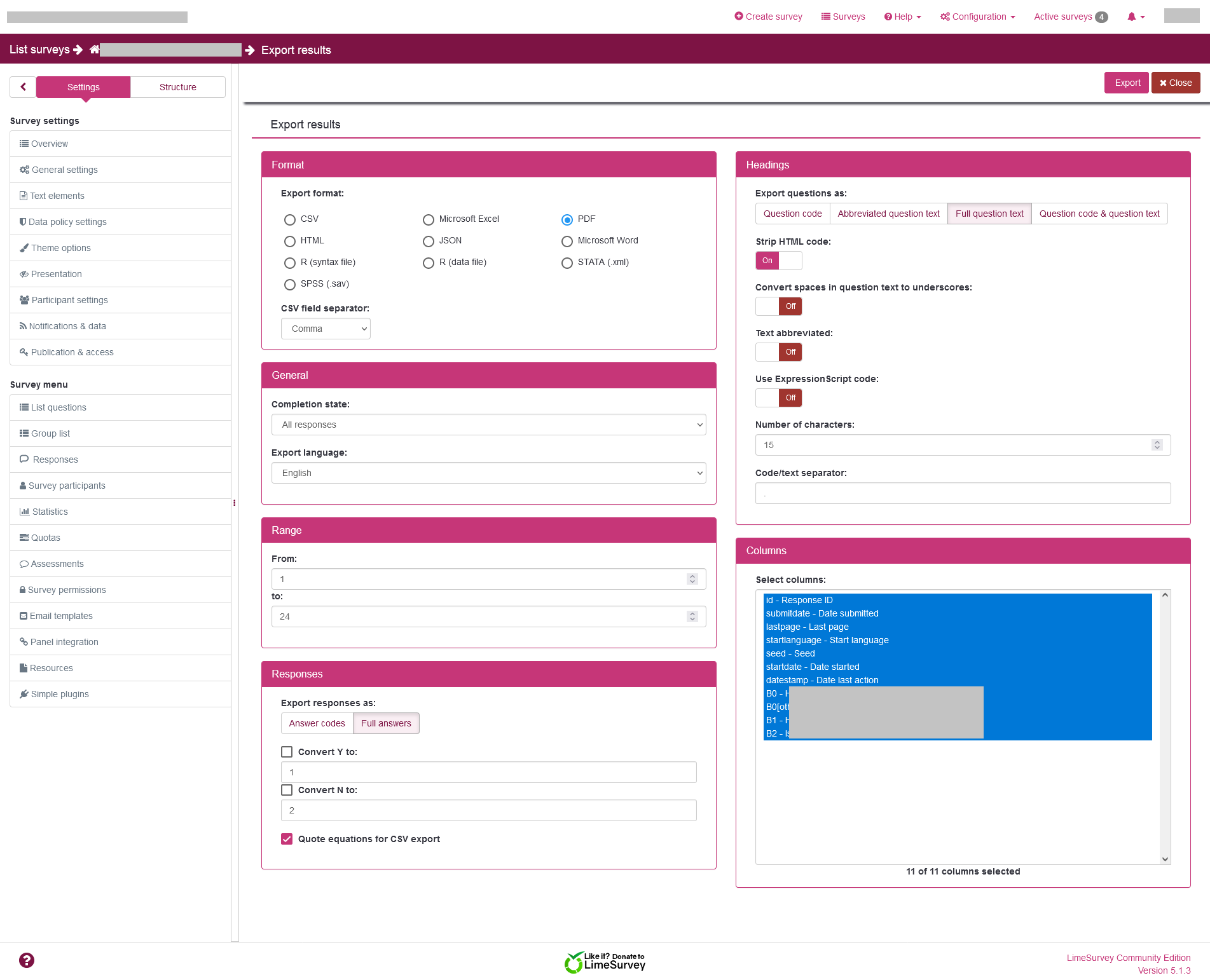 | Description | I'm getting this error whenever I try to Export Results of a survey:
