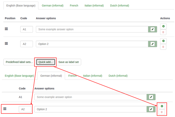 PR: https://github.com/LimeSurvey/LimeSurvey/pull/2093 The fix is for the specific problem of the ticket, which is the loading of labelsets in multilanguage surveys. But in the attached images you can see another problem, which I don't know if it has any impact but it would be good to correct: when you add answer options with the Quick Add option, the rows in the secondary languages are removable, movable, and with the editable Code. That can lead to inconsistencies. In master I could not reproduce the error because when trying to load the labelset it throws me this other error in a JS alert |