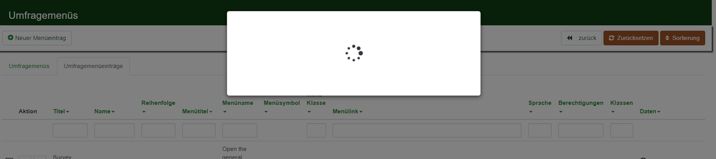 @xyzabc You're not supposed to reset the survey list, but the menu list. Details here: Please go to "Configuration" --> "Menu configuration" and click the reset button. Then, go to "Configuration" --> "Menu entries configuration" and click the reset button. After, try again to enter the page that failed. Let us know if the issue persists. Thank you. |