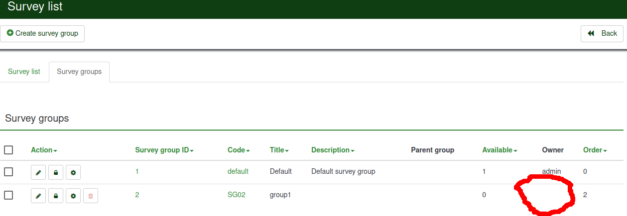 Example survey? The bug is not about one survey but survey group. To reproduce: Add a user. Add a survey group, set owner to be the user you just created. Delete the user. See attached picture, or the result in the DB: MariaDB [lime]> select gsid,title,owner_id from lime_surveys_groups; MariaDB [lime]> select uid from lime_users; |