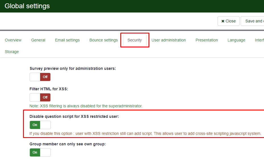 | Description | At Globnal Settings -> Security not only the description for the setting "Disable question script for XSS restricted user:" is difficult to understand, also the help text does not help much: If you disable this option : user with XSS restriction still can add script. This allows user to add cross-site scripting javascript system. | ||||