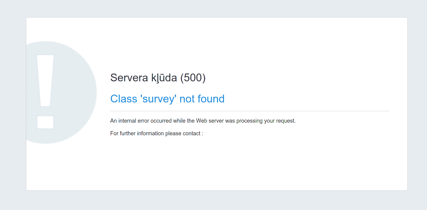5.2.1 still has this problem. Error Class 'survey' not found /var/www/survey/application/models/Permission.php(103) 091 public static function getEntityBasePermissions($sEntityName) Stack Trace 209 return $aBasePermissions; #1 380 @param ?string $sEntityName #2 195 $event = $this->getEvent(); #3 |