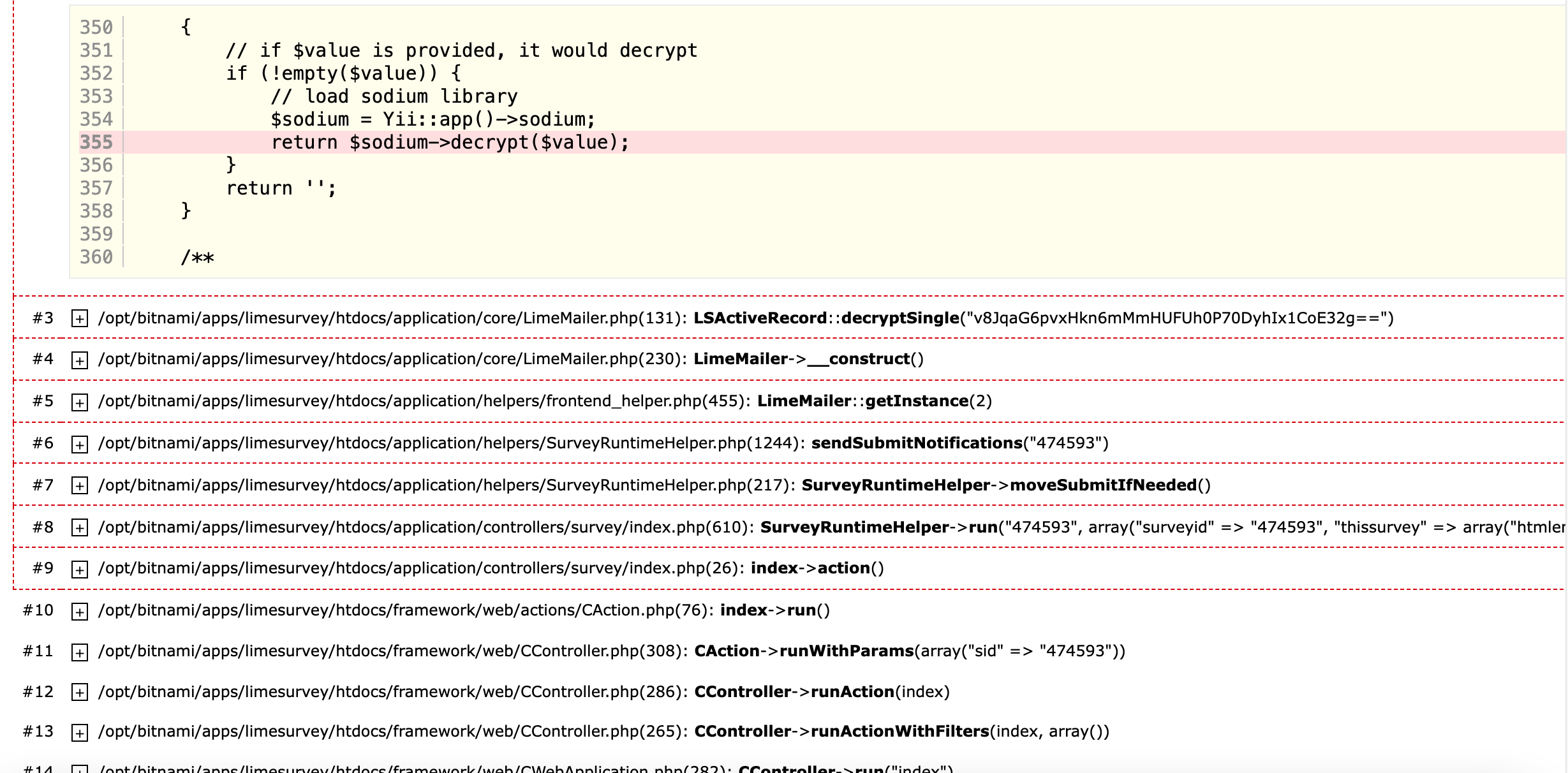 – /opt/bitnami/apps/limesurvey/htdocs/application/models/LSActiveRecord.php(355): LSSodium->decrypt("v8JqaG6pvxHkn6mMmHUFUh0P70DyhIx1CoE32g==")