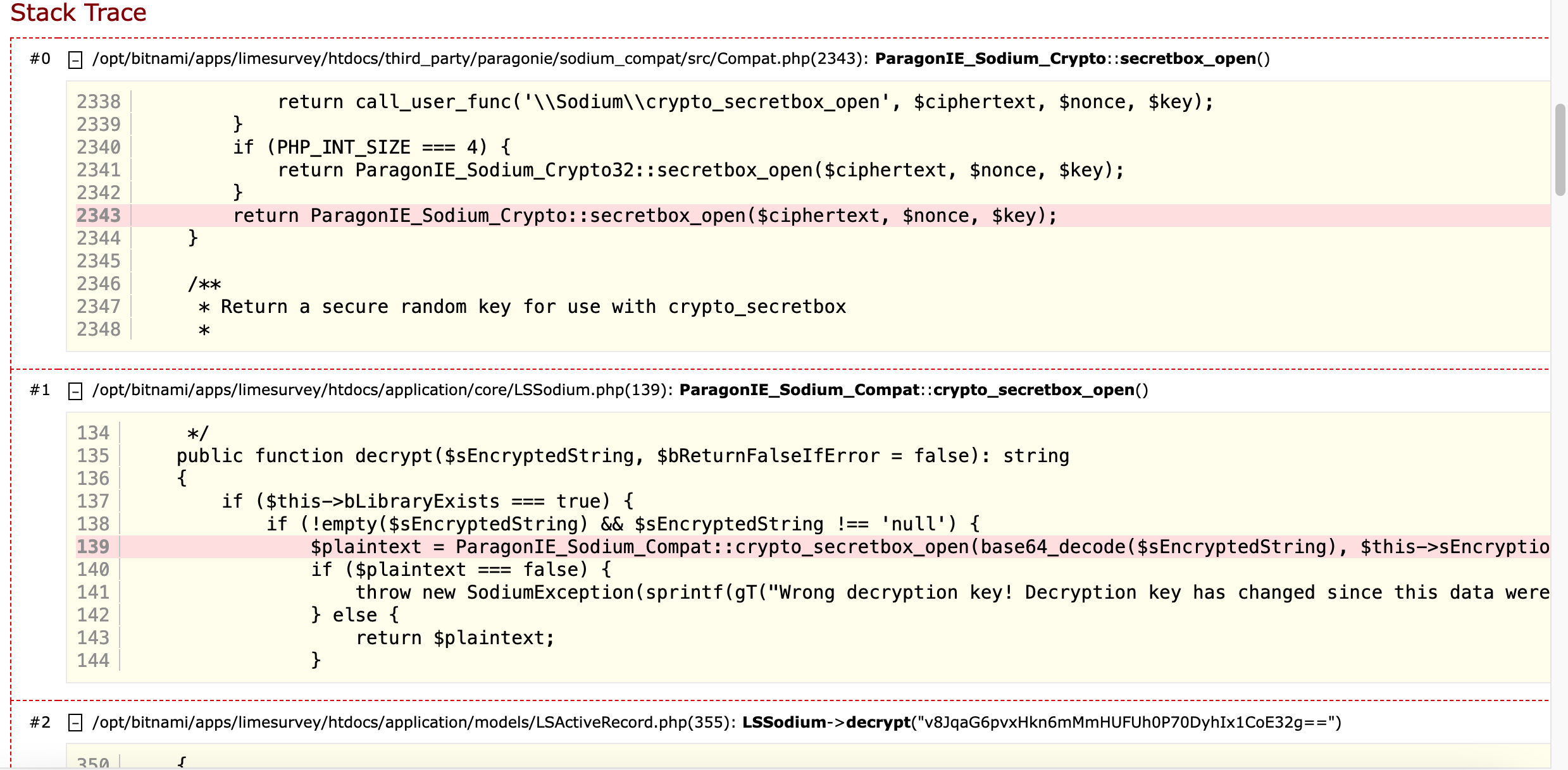 – /opt/bitnami/apps/limesurvey/htdocs/application/core/LSSodium.php(139): ParagonIE_Sodium_Compat::crypto_secretbox_open()