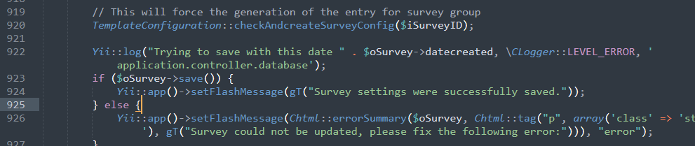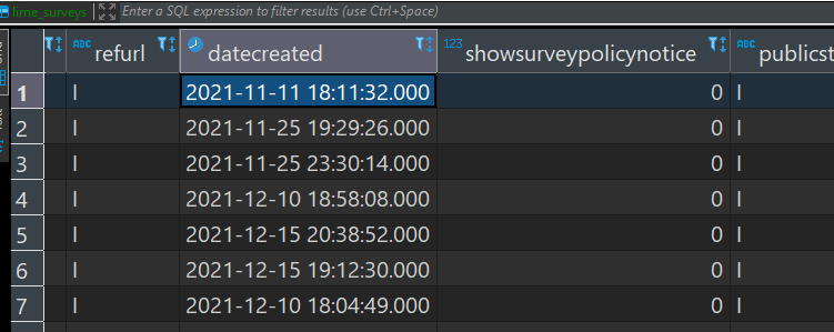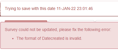 Hi Gabriel, the error happens with new and existing surveys. I've also noticed it happens when I try to save other survey properties as well, such as settings in the Publication and Access tab (Link survey on public index page), settings in the Presentation tab (Show "There are X questions in this survey"), etc. The lime_surveys.datecreated field in our Postgresql database is a timestamp of the form YYYY-MM-DD 24H:MM:SS.fff. For example, 2021-11-11 18:11:32.000 2021-12-15 20:38:52.000 2021-11-25 23:30:14.000. I've been able to side-step the GUI error by making manual changes to the database fields thus far. |