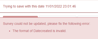 | Steps To Reproduce | Steps to reproduceMake a survey (it can be blank with no questions). Expected resultThe theme is updated. Actual resultThe theme is not updated and a red banner will appear with the Datecreated is invalid error message. (See screenshot) | ||||