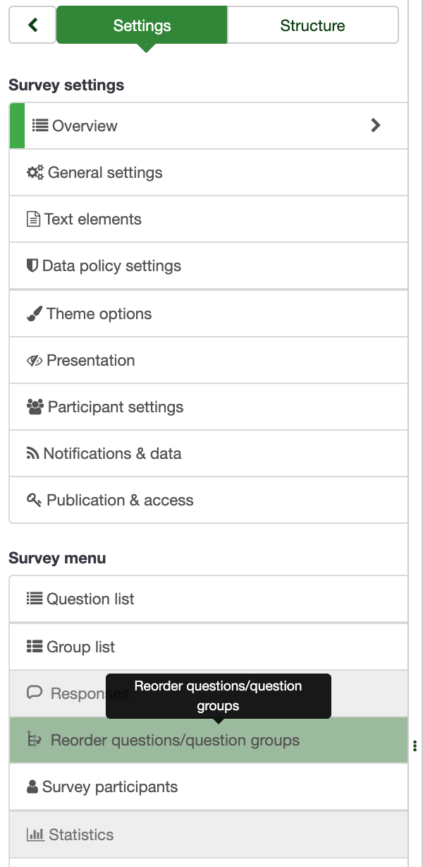 | Steps To Reproduce | Check the left menu on any Survey. Click on "Settings" at the very top. | ||||